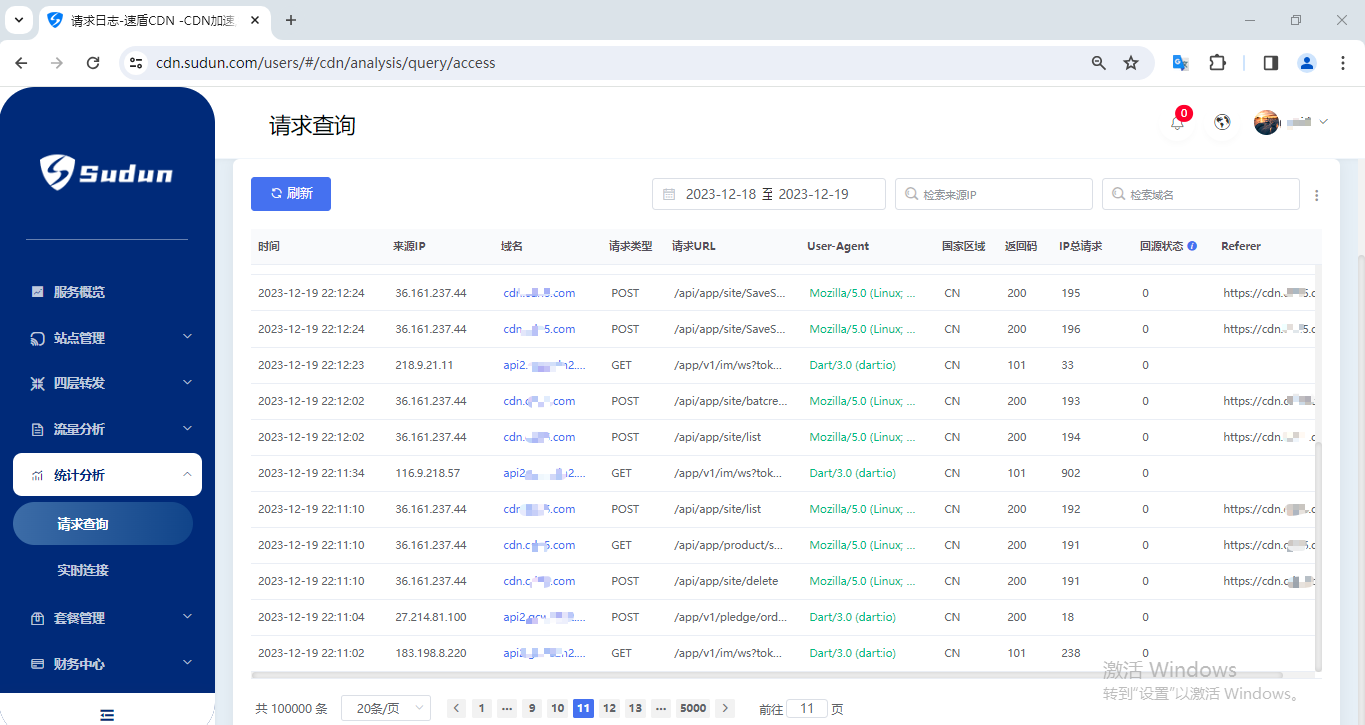 如果网站有攻击,比如各类型的cc攻击、变种cc、ssl握手攻击等等,都会在统计分析、请求查询里详细分析出来,每个纬度的日志分析均详细展示,可以立即知晓攻击方式及来源。