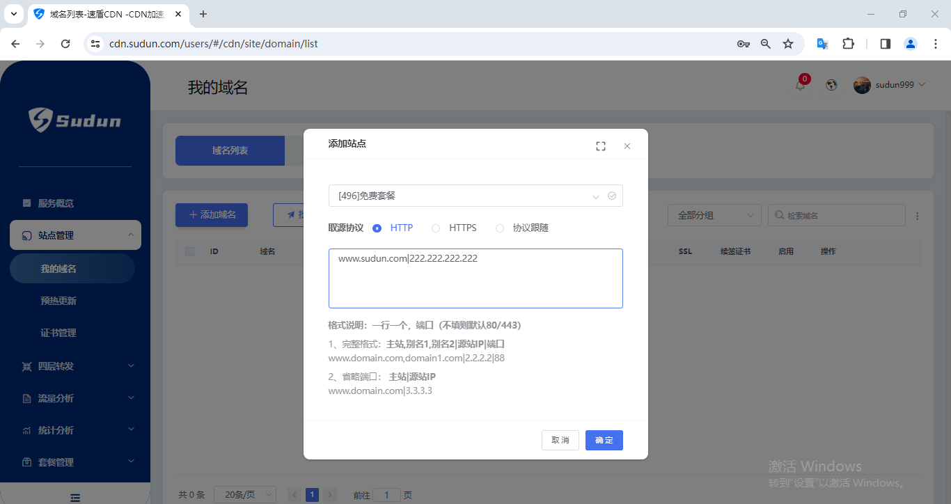 以上都是查看日志分析的方式,现在给大家介绍如何添加域名,点击站点管理,我的域名,点击添加域名,因为注册即可赠送免费套餐,所以无需开通任何套餐,直接添加即可使用,添加格式为:www.domain.com|3.3.3.3 例如我要添加我的官网速盾域名,那么格式就是 www.sudun.com|222.222.222.222 前面是域名,后面是源IP,中间填竖线,不要有任何空格,否则添加会失败。